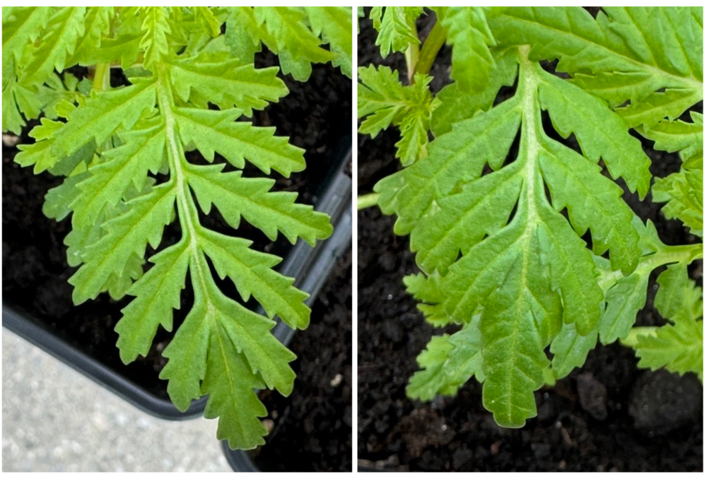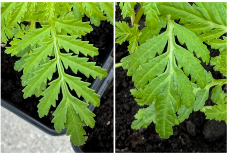 One key result was the occurrence of recognizable differences in the growth of plants cultivated under qualitatively different colour light, for example in Tagetes tenuifolia grown under green iron MFL. Changes in leaf architecture were observed here that did not occur under green PFL. Interesting differences were also observed in Kalanchoe daigremontianum and Lavandula officinalis. The leaves of plants grown under the metal-coloured glasses showed distinct spotting on the underside, whereas the leaves of plants grown under the colour films showed little or only delayed spotting. These findings suggest that metal colour light exerts independent and qualitatively differentiated influences on plant growth processes that go beyond the purely chromatic effect.