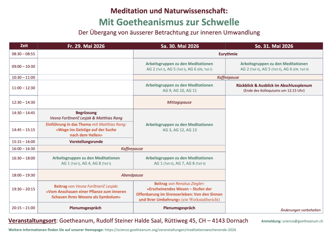 Zu diesem Thema werden wir uns am Wochenende nach Pfingsten in einem Meditationskolloquium austauschen. Wir freuen uns, wenn Sie uns in einer Arbeitsgruppe auf Ihrem Forschungsweg mitnehmen wollen und Ihr Schwellenerlebnis – so präzis wie möglich – mit uns teilen.